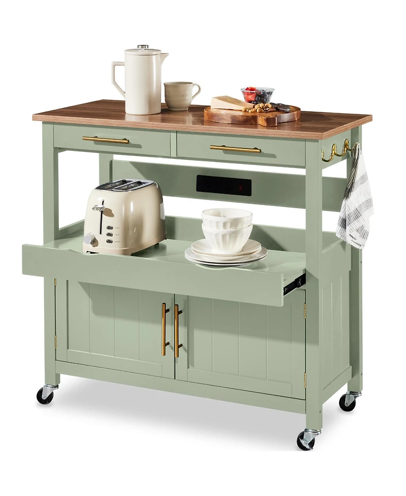 Transform any room with this versatile storage cart, perfect as a kitchen island, dining sideboard, or craft station. A smooth slide-out shelf keeps appliances and supplies within reach, while built-in outlets power devices without clutter. Drawers, a 2-door cabinet, and locking swivel wheels offer organized convenience and effortless mobility for everyday use.