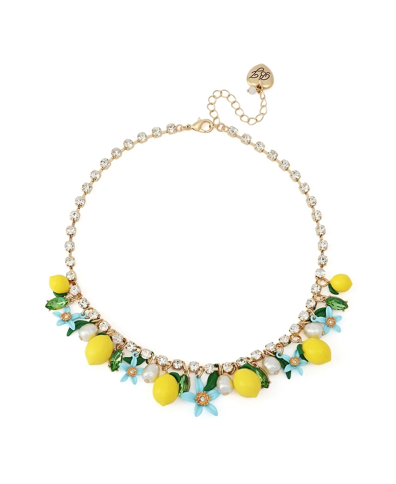 It's time for Girl Dinner with this playful bib necklace featuring glistening rhinestone chain paired with coordinating lemons, flowers and pearls.
