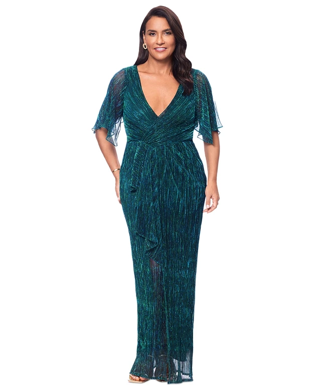 Betsy & Adam Petite Cape-Back Metallic Gown