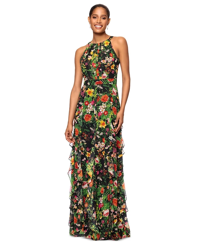 Betsy & Adam Women's Floral Print Ruffled Sleeveless Gown