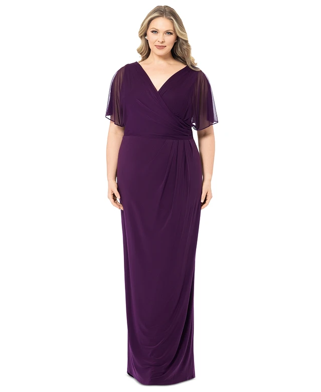 Betsy & Adam Plus Draped-Back Flutter-Sleeve Gown