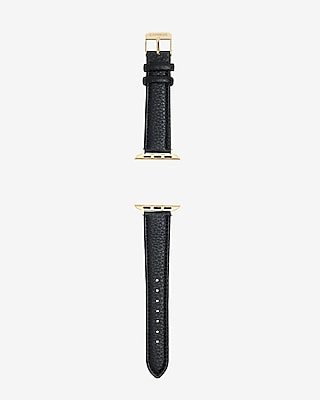 A black faux leather smart watch band complete with silver accents, a buckle closure, and double loops.