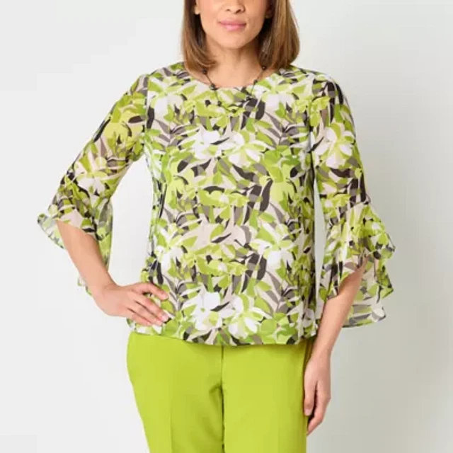 Black Label by Evan-Picone Floral Womens Crew Neck 3/4 Sleeve Blouse