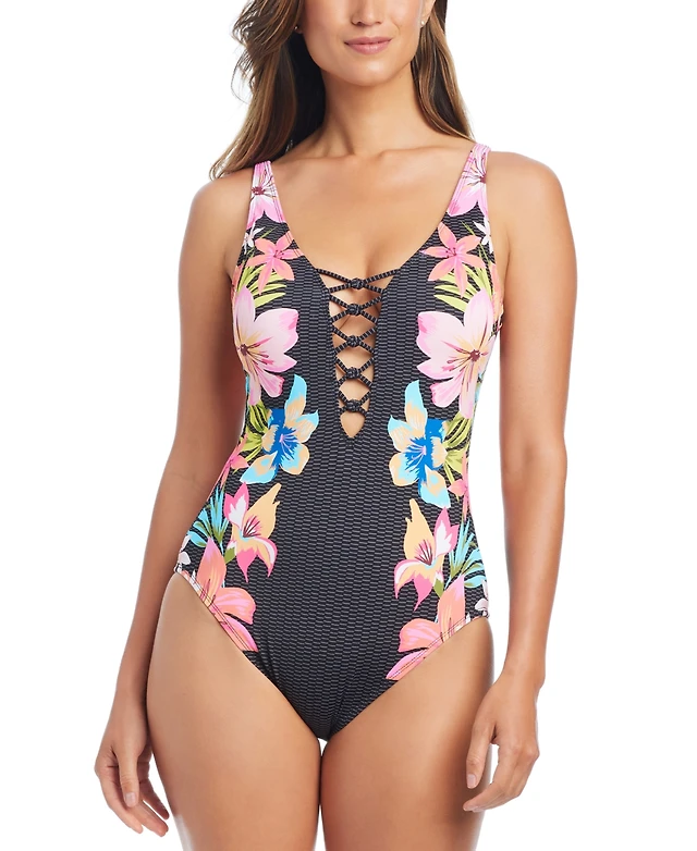 Bleu by Rod Beattie Women's Sweet Escape Floral-Print Lace-Down One-Piece Swimsuit