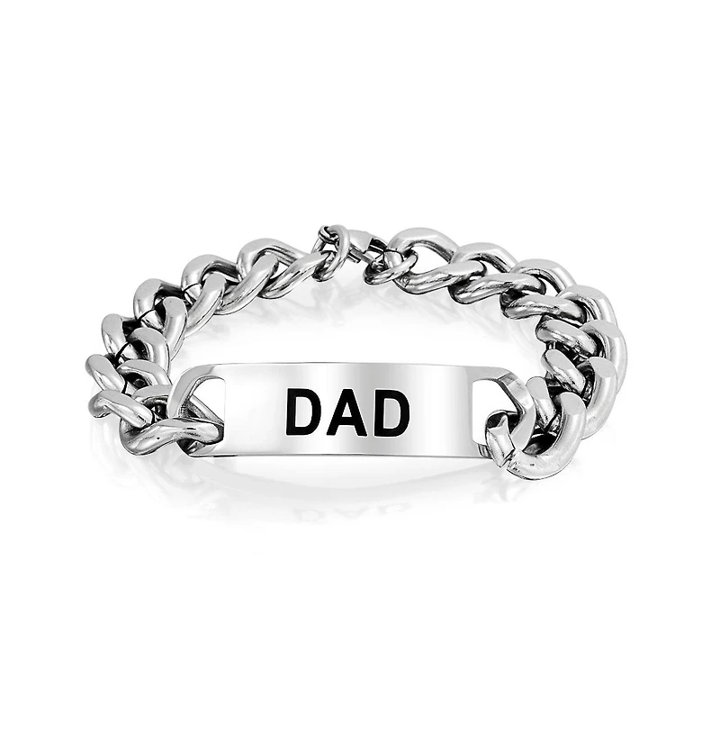 Give the gift to your Dad you know he will cherish. This lustrously handsome mens bracelet features a stunning, stainless steel, curb chain exuding masculine appeal with an id tag at center rendered with the word "Dad" with bold, black ip plating.