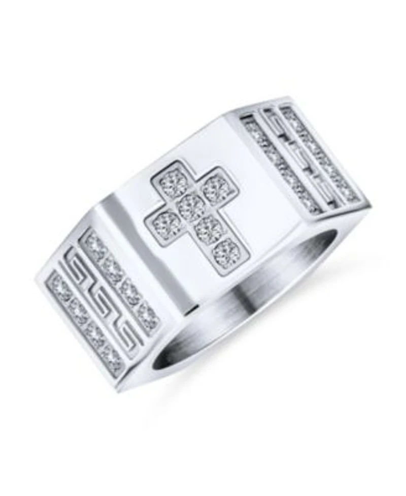 Bling Jewelry Religious Wide 6 Side Christian Greek Key Cubic Zirconia Cz Accent Cross Statement Ring Band Silver Tone Stainless Steel
