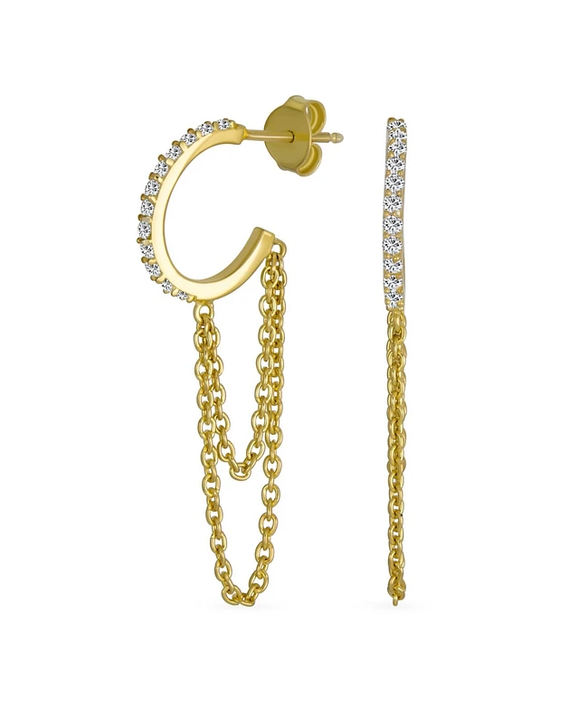 Bling Jewelry Trendy Cz Stud Earrings with Double Chain Huggie Hoop in Gold Plated Sterling Silver