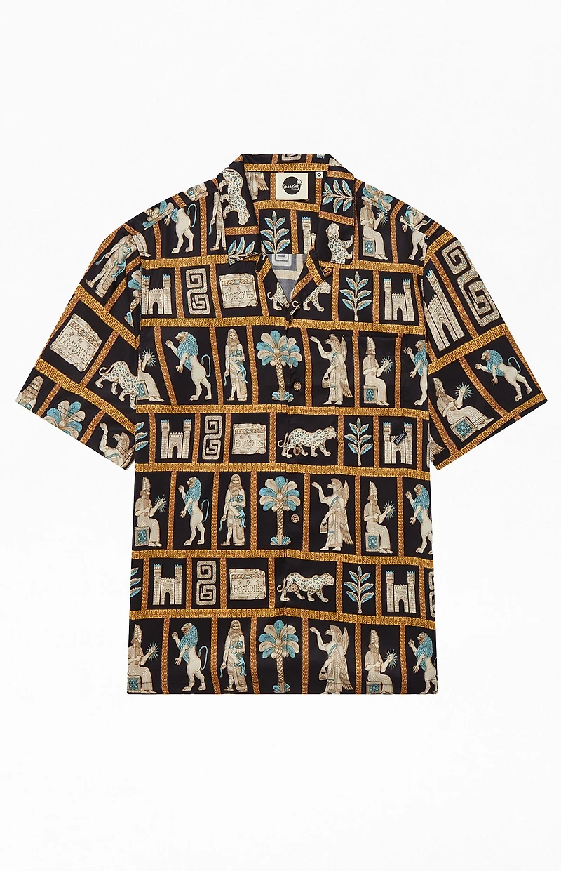 Travel back in time to the ancient wonders of the world with the Mesopotamia Camp Shirt from Boardies. This shirt boasts a bold, hand drawn print, a collared neckline, short sleeves, a left chest pocket and button-down front closures for a laid-back look.