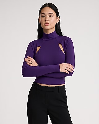 Smooth, sculpt, and define your figure with this mock neck long sleeve cutout cropped tee. This style has a double layer of compact matte fabric.