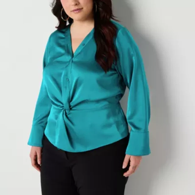 Bold Elements Womens Plus V Neck Long Sleeve Satin Blouse