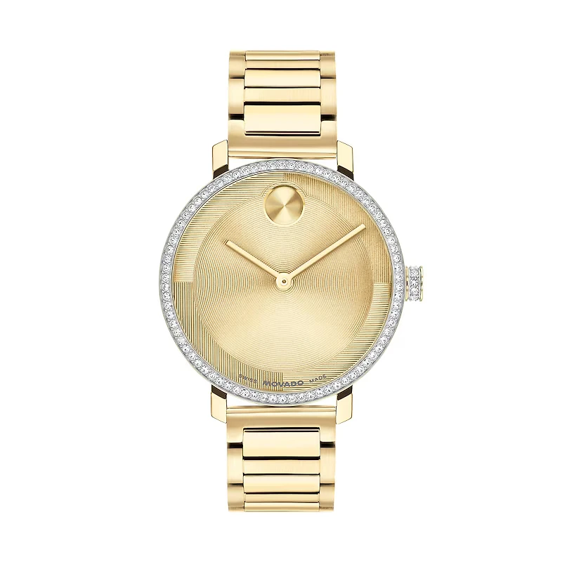 - Swarovski Crystal-set bezel and crown surrounding a yellow gold-plated dial