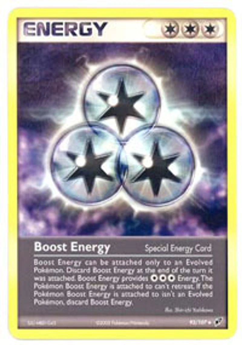 Boost Energy can be attached only to an Evolved Pokemon. Discard Boost Energy at the end of the turn it was attached. Boost Energy provides 3 Colorless Energy. The Pokemon Boost Energy is attached to can't retreat. If the Pokemon Boost Energy is attached to isn't an Evolved Pokemon