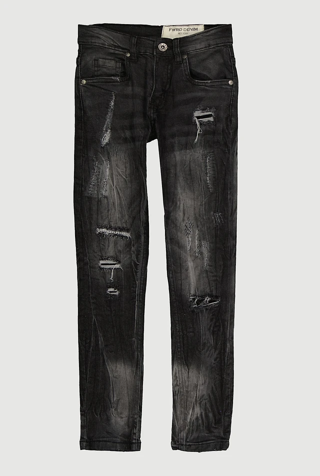 Boys Frayed and Distressed Whiskered Jeans, Black, Size 16