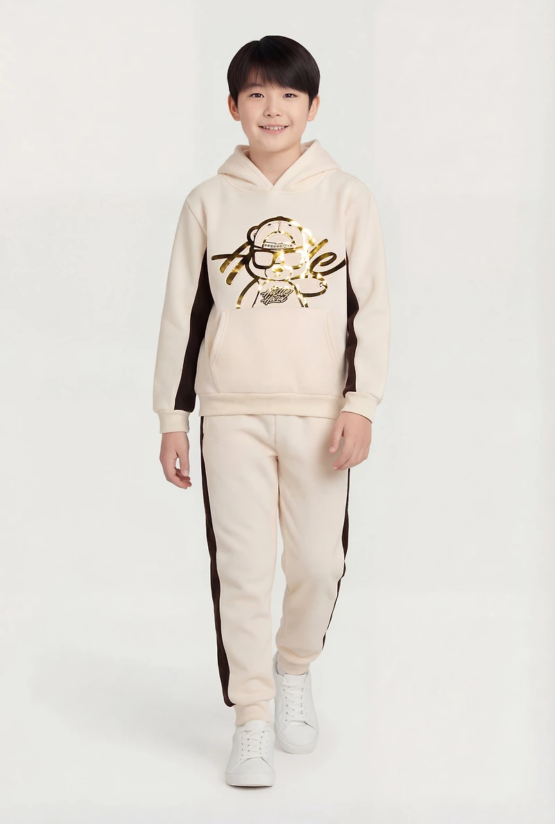 This boys' two-piece set features a hoodie with long sleeves and tapered jogger pants designed for everyday casual wear. The fleece fabric keeps him cozy, while the foil screen graphic adds a cool, standout vibe. Perfect for school days or weekend hangouts.