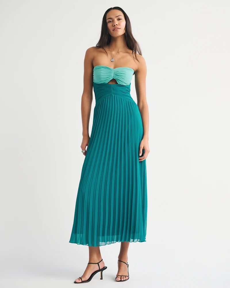 Our new collection built to make going bra-free that much smoother. This flattering strapless maxi dress is in our ultra sheer crepe fabric. Features a flowy skirt, front cutout detail, pleating details along the bodice and a seamed-in bra with removable pads.