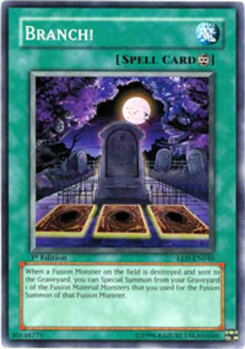 Card Rules: Rulings powered by The Netrep Passcode: 30548775 Set: Elemental Energy Card Number: EEN-EN046 Rarity: Common Attribute: Spell Card Text: When a Fusion Monster on the field is destroyed and sent to the Graveyard , you can Special Summon from your Graveyard 1 of the Fusion Material Monsters that you used for the Fusion Summon of that Fusion Monster. Card Type: Continuous Spell Name: Branch! Edition: 1st
