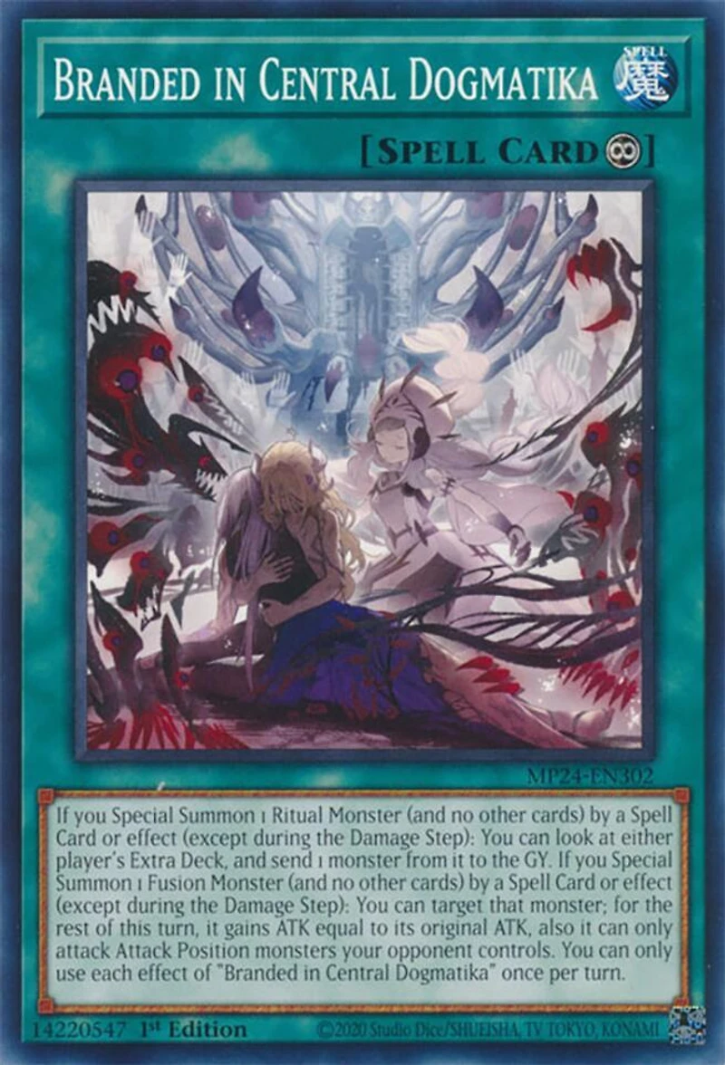 Set: 25th Anniversary Tin: Dueling Mirrors Card Number: MP24-EN302 Rarity: Common Attribute: SPELL Card Text: If you Special Summon 1 Ritual Monster (and no other cards) by a Spell Card or effect (except during the Damage Step): You can look at either player's Extra Deck , and send 1 monster from it to the GY. If you Special Summon 1 Fusion Monster (and no other cards) by a Spell Card or effect (except during the Damage Step): You can target that monster; for the rest of this turn it gains ATK equal to its original ATK also it can only attack Attack Position monsters your opponent controls. You can only use each effect of "Branded in Central Dogmatika" once per turn. Card Type: Spell Name: Branded in Central Dogmatika Edition: 1st