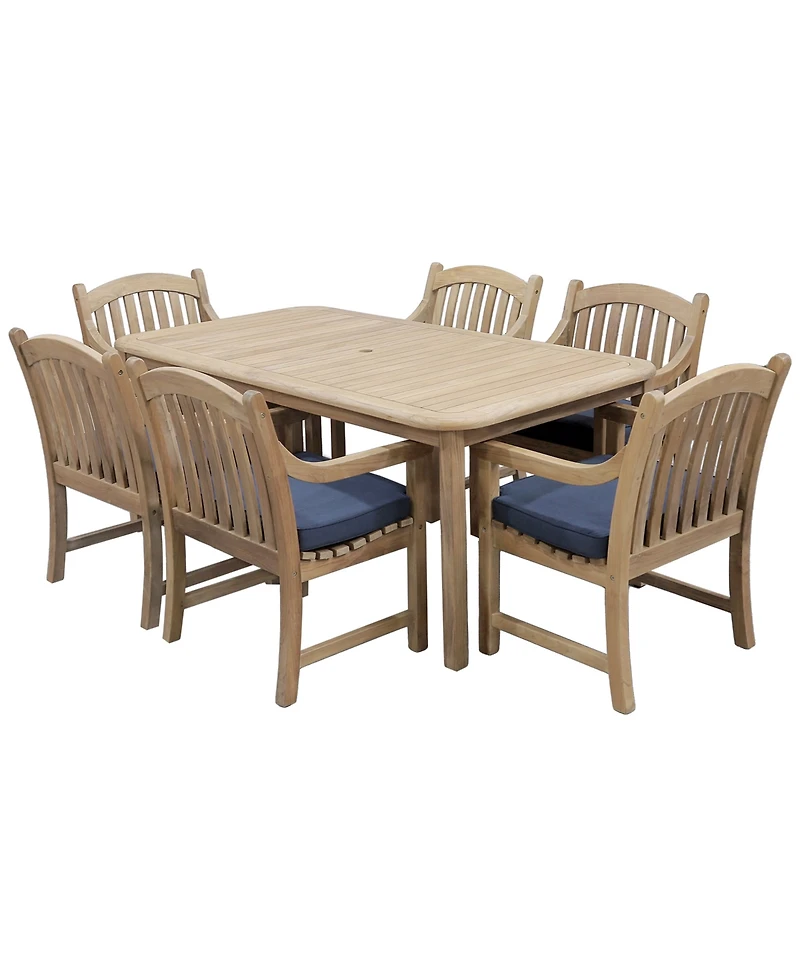 Wondrous teak construction provides an earthy feel to this beautiful seven-piece outdoor dining set. The gentle curves of the arm chairs are complemented by delightful rich toned fabric that blends magnificently with the natural teak.