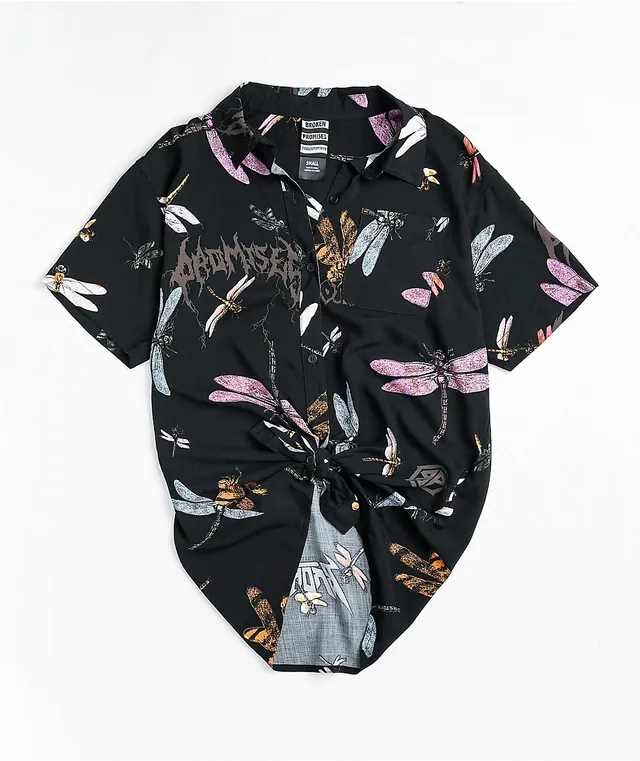 Broken Promises Dragonflies Black Tie Front Short Sleeve Button Up Shirt
