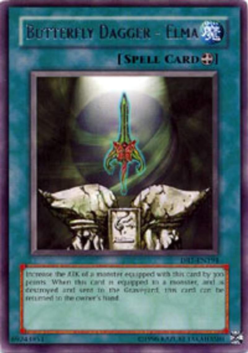 Card Rules: Rulings powered by The Netrep API. Missing the Timing: Because the effect of 'Butterfly Dagger - Elma' is an optional 'when... you can' Trigger Effect , 'Butterfly Dagger - Elma' being sent to the Graveyard has to be the very last thing that happened in order for you to activate its effect. So if it is destroyed in the middle of a chain you cannot return it to your hand. Example: If the turn player activates 'Pot of Greed' and the opponent chains 'Mystical Space Typhoon' to destroy 'Butterfly Dagger - Elma' during the chain it cannot return to the owner's hand. If the monster that 'Butterfly Dagger - Elma' is equipped to is destroyed as a result of battle or by a card effect like 'Sakuretsu Armor' or 'Fissure' then 'Butterfly Dagger - Elma' cannot return to your hand because it is no longer equipped to a monster. However if the monster and the 'Butterfly Dagger - Elma' are destroyed simultaneously by a card like 'Final Destiny' then you can return it to your hand. While 'Imperial Order' is active if 'Butterfly Dagger - Elma' is destroyed and sent to the Graveyard it can return to your hand. When you activate 'Butterfly Dagger - Elma' and your opponent chains 'Mystical Space Typhoon' it cannot return to your hand. When 'Butterfly Dagger - Elma' is 'sent to the Graveyard' without being 'destroyed' such as with 'Woodland Sprite' it cannot return to your hand. If 'Butterfly Dagger - Elma' is negated and destroyed by 'Ryu Senshi' or 'Freed the Matchless General' it cannot return to your hand. While 'Morale Boost' is active if you equip 'Butterfly Dagger - Elma' to 'Gearfried the Iron Knight' 1) Increase your Life Points for 'Morale Boost' 2) destroy 'Butterfly Dagger - Elma' with 'Gearfried the Iron Knight''s effect 3) inflict damage for 'Morale Boost' when 'Butterfly Dagger - Elma' is sent to the Graveyard 4) the owner of 'Butterfly Dagger - Elma' can return it to his/her hand. If 'Butterfly Dagger - Elma' is destroyed during the Damage Step such as by the effect of 'Cliff the Trap Remover' you cannot activate the effect that returns 'Butterfly Dagger - Elma' to the hand. [Re: A Hero Emerges] When 'Guardian Elma' is selected for 'A Hero Emerges' and you have 'Butterfly Dagger - Elma' on your side of the field you can Special Summon her but if you don't have it then she is sent to the Graveyard. [Re: Pole Position] EXAMPLE #6 The opponent has 'Blade Knight' (1600 ATK) equipped with 'Butterfly Dagger - Elma' (+300 ATK 1900 ATK total) and 2 cards in hand along with 'Marauding Captain' (1200 ATK). The turn player has 'Robbin' Goblin' 'Pole Position' and 'Giant Orc' (2200 ATK). The turn player attacks 'Marauding Captain' with 'Giant Orc' inflicting 1000 points of damage. The opponent has to discard a card because of 'Robbin' Goblin' and an infinite loop is created because 'Blade Knight' now fluctuates between 2300 and 2000 ATK (either above or below 'Giant Orc' making it the strongest monster on the field... or not). Therefore 'Pole Position' is destroyed. [Re: Woodland Sprite] An Equip Spell Card sent to the Graveyard by this card's effect is not 'destroyed'. So the effects of 'Butterfly Dagger - Elma' 'Axe of Despair' 'Malevolent Nuzzler' 'Blast with Chain' or 'Smoke Grenade of the Thief' cannot or will not be activated. Passcode: 69243953 Set: Dark Revelations 1 Card Number: DR1-EN194 Rarity: Rare Attribute: Spell Card Text: Increase the ATK of a monster equipped with this card by 300 points. When this card is equipped to a monster and is destroyed and sent to the Graveyard this card can be returned to the owner's hand. Card Type: Equip Spell Name: Butterfly Dagger - Elma Edition: Unlimited
