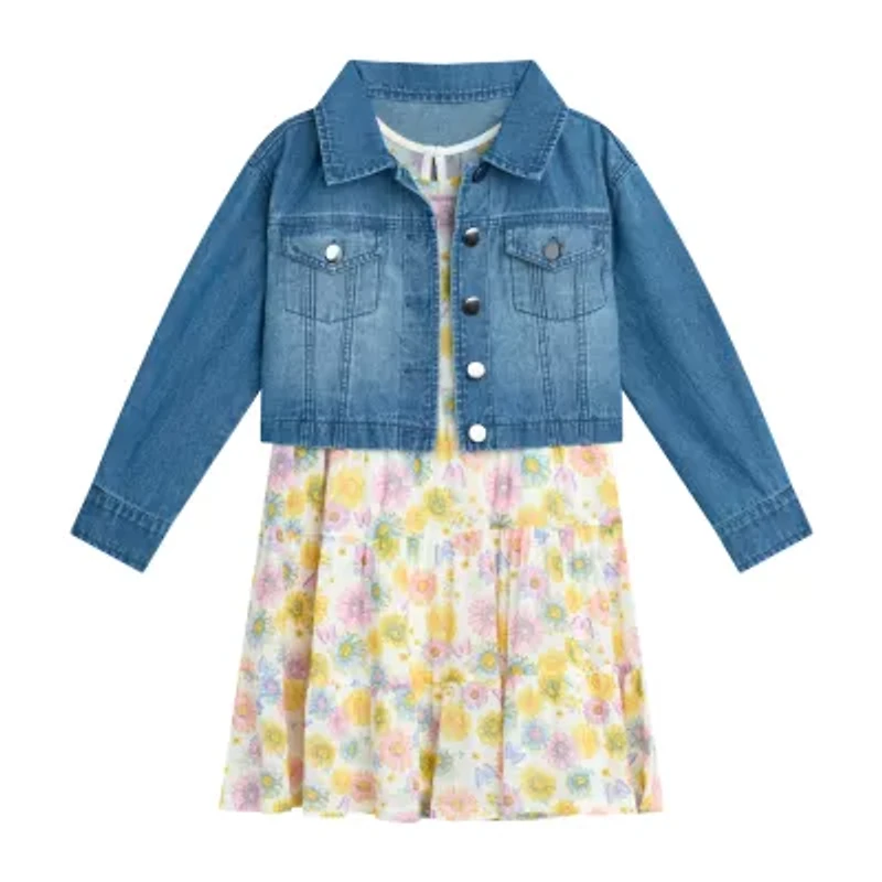 Make her outfit versatile and easy-to-wear with this 2-piece set from by&by's little girl's collection. It includes a cotton-denim jacket and a short-sleeve crew neck floral dress that effortlessly flows in a summer breeze.
