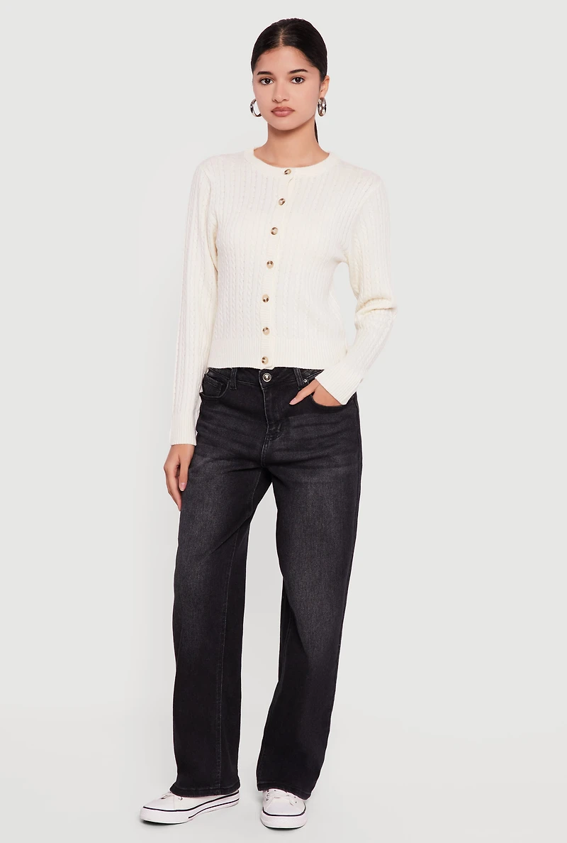 Stay cozy and cute with this Cable Knit Button Front Cardigan. Featuring a timeless classic fit and a flattering crew neck, this long-sleeve knit is perfect for layering or wearing on its own. The button front adds a playful touch while keeping things easy and breezy. Whether you're dressing up or down, this casual cardigan is your new go-to for effortless style and comfort. Soft cable knit fabric for warmth and texture Classic fit that flatters every shape Crew neck for a clean, versatile look Button front closure for easy wear Cropped length to pair perfectly with high-waisted bottoms Long sleeves for cozy coverage Model Pictured Wearing Size S Height 5 ft 9 in, Bust 32 in, Waist 24 in, Hips 34 in Fits True To Size Content and Care Material: 71% Polyester, 18% Acrylic, 11% Nylon Care Instructions: Hand Wash Country Of Origin: Bangladesh Rainbow Item Number 3022054267646 IVORY - 3022054267646011
