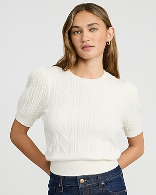 Created in a cozy sweater fabric, this sweater features short puff sleeves and a classic cable knit design. The perfect elevated casual style to elevate your look this season.