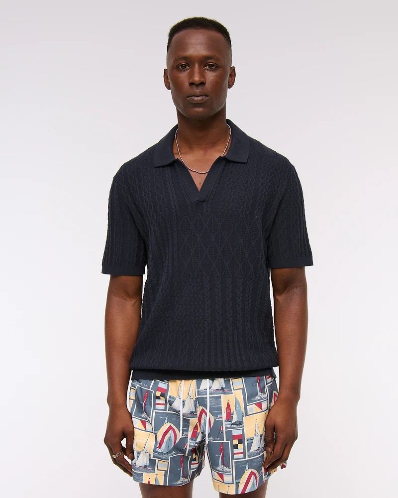Short-sleeve sweater polo in our soft sweater-knit fabric and relaxed-fit silhouette, featuring cable patchwork stitching details throughout, no-button Johnny collar and banded hem and cuffs.