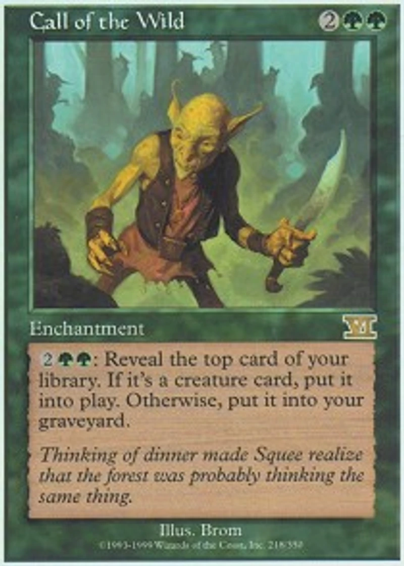 Color: Green Card Text: 2GG Reveal the top card of your library. If it's a creature card , put it into play. Otherwise put it into your graveyard. Rarity: R Cost: 2GG Card Type: Enchantment Artist: Brom Name: Call of the Wild Finish: Regular Card Number: 218/350 Set Name: Sixth Edition