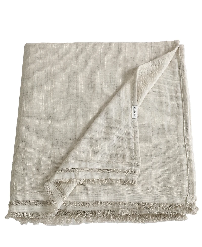 This linen-cotton throw embodies the Calvin Klein aesthetic with its lightweight drape and subtle, natural finish. It layers seamlessly across the bed or sofa. Frayed-edge detailing adds a touch of raw refinement.