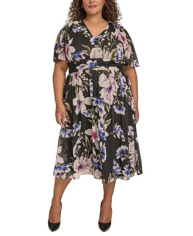 Calvin Klein Plus Floral-Print Flutter-Sleeve Chiffon Dress