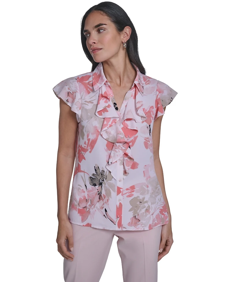 Calvin Klein Women's Printed Cap-Sleeve Ruffle Front Top