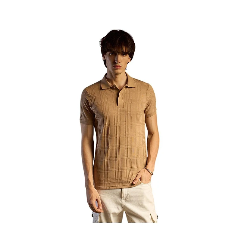 Campus Sutra Men's Buff Beige Intertwine-Textured Polo T-Shirt