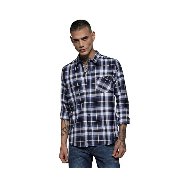 Campus Sutra Men's Navy Blue Tartan Plaid Shirt