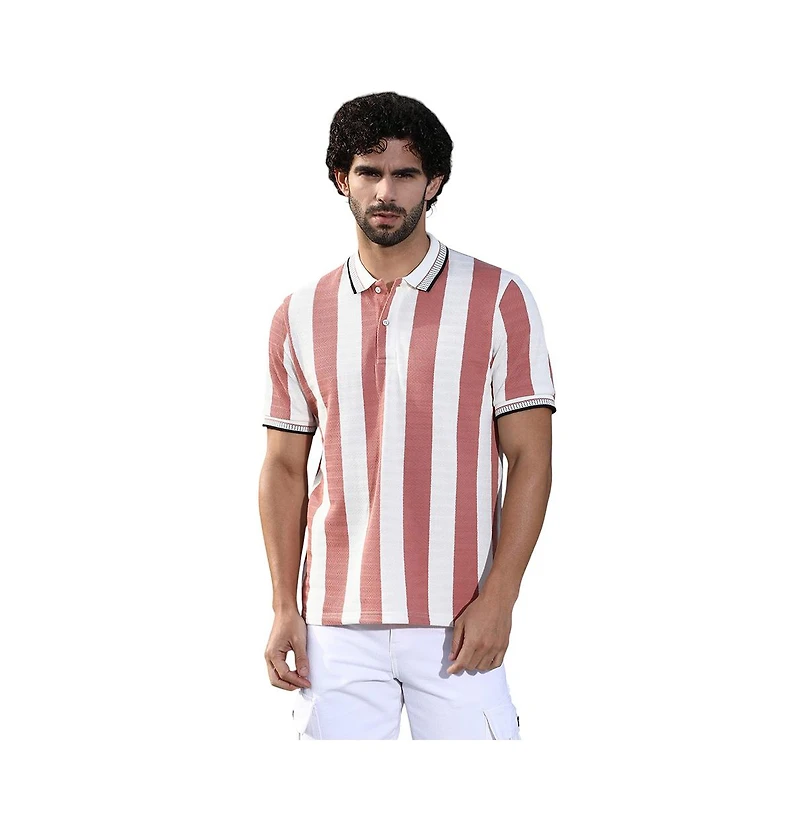 Campus Sutra Men's Nude Pink & Cream White Awning-Striped Polo T-Shirt