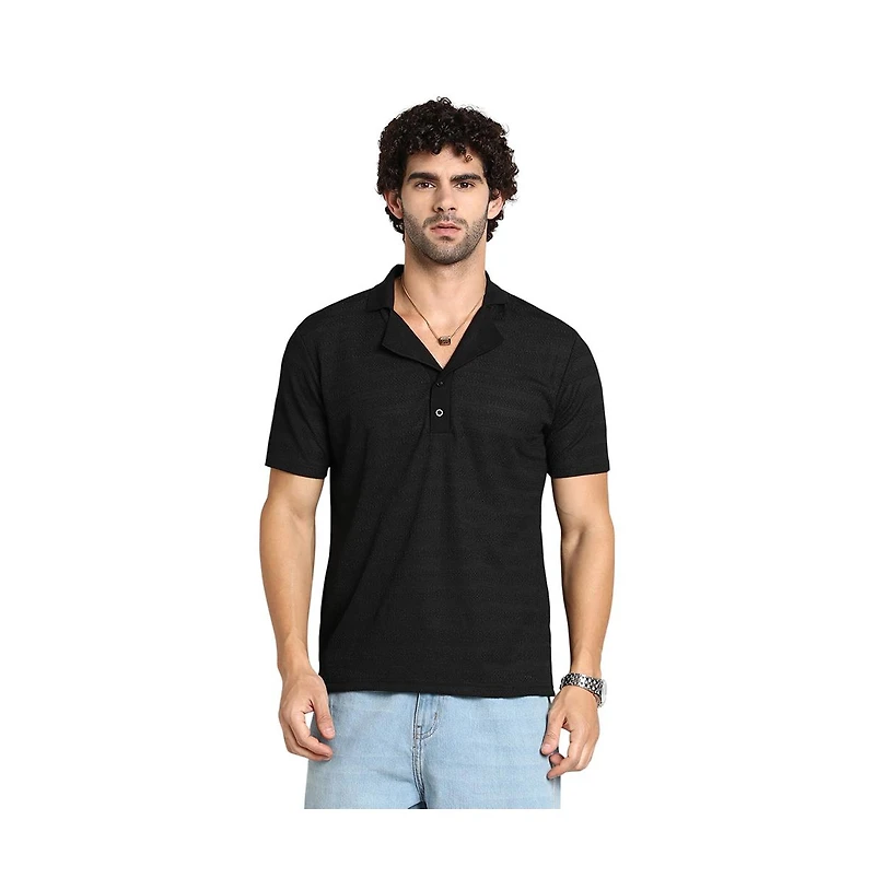 Campus Sutra Men's Onyx Black Panel-Tactile Cuban Polo T-Shirt