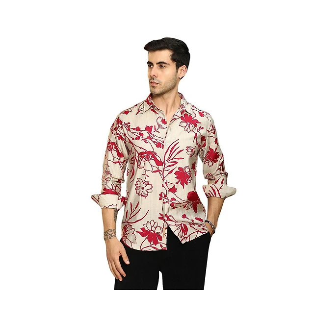 Campus Sutra Men's Cream White & Scarlet Red Floral-Tactile Relaxed Shirt