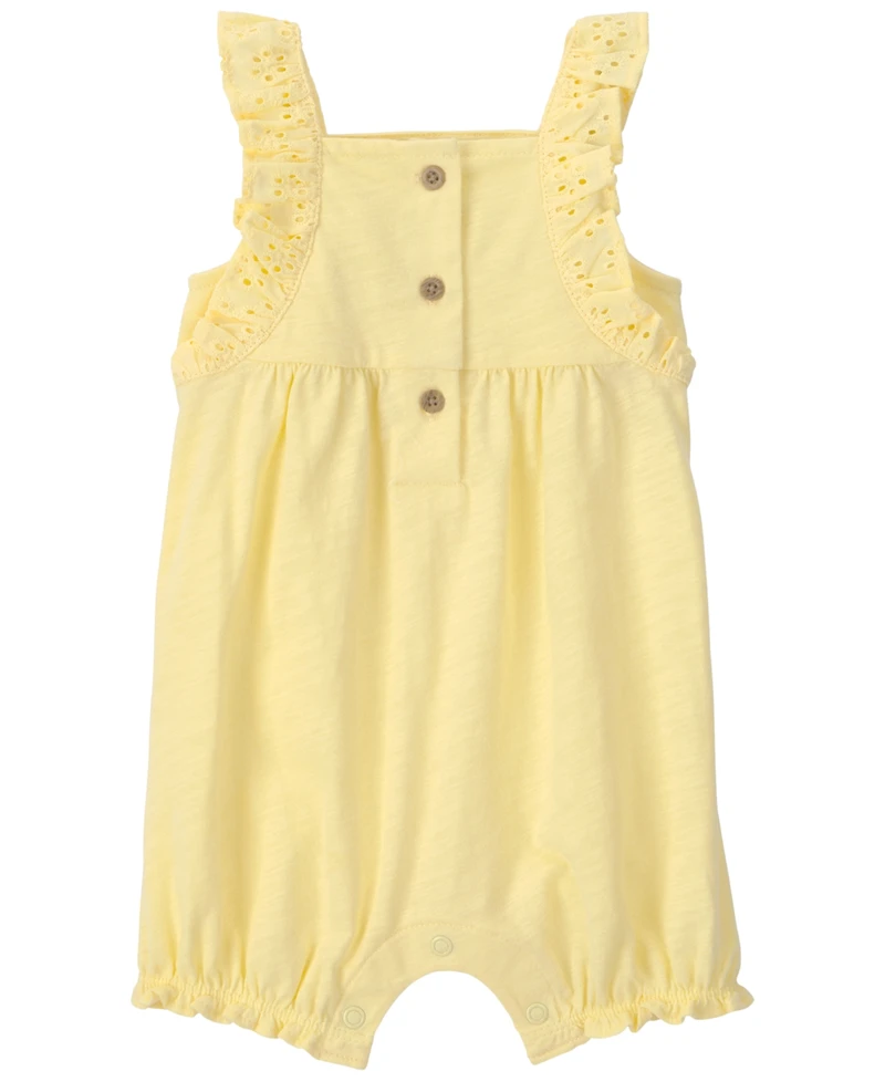 Sunny-day charm comes alive in this Carter's romper, crafted from soft, breathable fabric that keeps your little one comfortable through every adventure. Flutter sleeves and a button-front design simplify dressing, while cheerful ruffles add playful style for warm-weather outings.