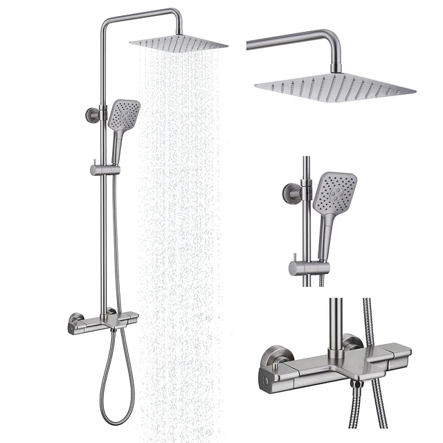 Casainc Thermostatic 9.8" Square Shower System with 3 Spray Modes Hand Shower