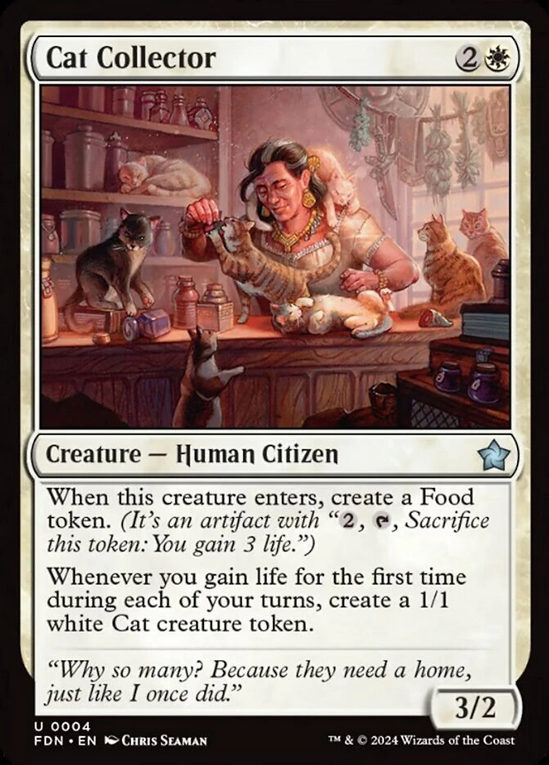 Color: White Card Text: "Why so many? Because they need a home , just like I once did." Rarity: U Cost: 2W Pow/Tgh: 3/2 Card Type: Creature - Human Citizen Artist: Chris Seaman Name: Cat Collector Finish: Regular Card Number: 0004 Set Name: Foundations