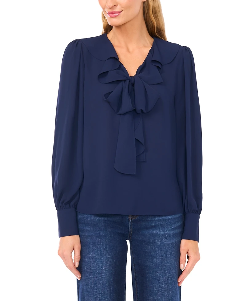 Bring a vibrant touch to your wardrobe with this ruffle tie top from CeCe. Crafted in a pull-on design with a body-lined finish, it features a softly gathered neckline and bow detail for an elevated, feminine look. About The Brand: CeCe is a contemporary lifestyle brand inspired by a romantic take on the everyday, punctuated by taste, wit, and on-the-go flair.