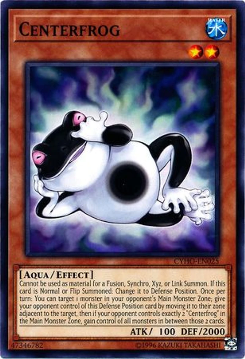 Passcode: 47346782 Set: Cybernetic Horizon ATK/DEF: 100/2000 Card Number: CYHO-EN025 Monster Type: Monster Rarity: Common Attribute: Water Card Text: Cannot be used as material for a Fusion , Synchro Xyz or Link Summon. If this card is Normal or Flip Summoned: Change it to Defense Position. Once per turn: You can target 1 monster in your opponent's Main Monster Zone; give your opponent control of this Defense Position card by moving it to their zone adjacent to the target then if your opponent controls exactly 2 ?Centerfrog? in the Main Monster Zone gain control of all monsters in between those 2 cards. Level: 2 Name: Centerfrog Edition: Unlimited