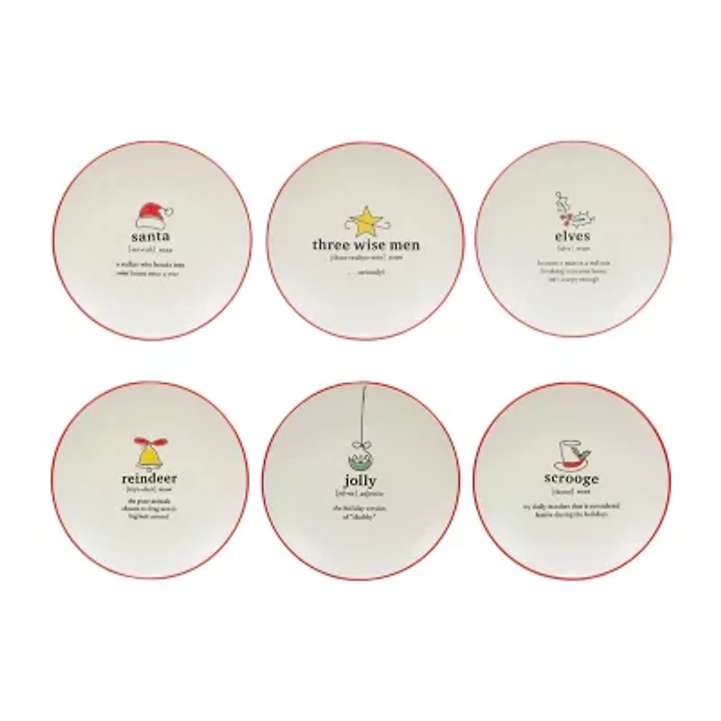 Clever definitions of popular Christmas icons decorate ceramic mugs and dessert plates in certified international's "Christmas fun" collection, designed by Courtney Morgenstern. Enjoy reading each one and laughing with your family and friends as you enjoy your favorite holiday hot or cold beverages and treats. Sets include mix and match assorted icons and phrases on white ceramic, accented with solid red or green. A fun way to celebrate the holidays and great for gifts! Set includes 6- 8.5" dessert plates.