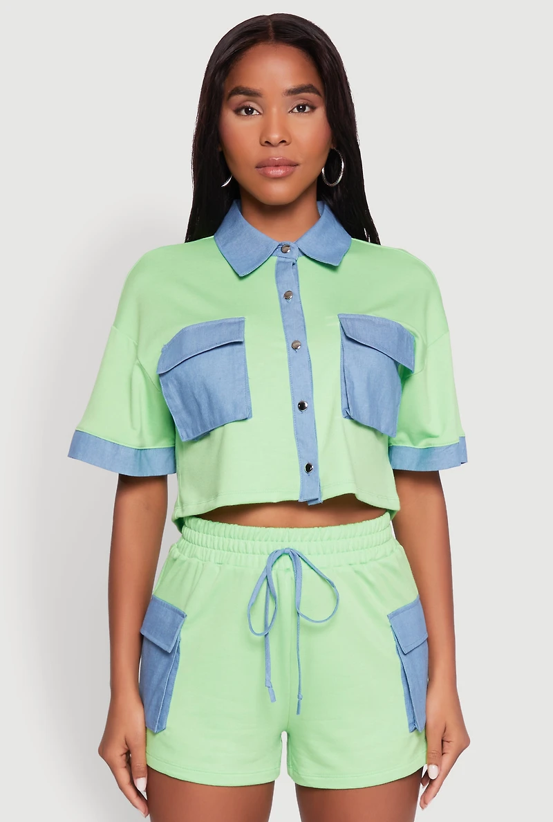Get ready to turn heads with the Chambray Detail Short Sleeve Crop Top, the perfect blend of casual cool and effortless style. Featuring a charming chambray detail and a classic shirt collar, this top offers a timeless silhouette that pairs perfectly with your favorite jeans or skirts. The button front adds a touch of vintage flair, while the cropped hem keeps your look fresh and flirty. Made from soft French Terry, it’s as comfortable as it is stylish—ideal for those laid-back days or casual outings. Elevate your wardrobe with this versatile piece that’s all about easy, everyday fashion. Chambray detail adds a stylish touch Button front for a vintage-inspired look Classic fit with a timeless silhouette Cropped hem for a trendy, flirty vibe Made from soft French Terry for all-day comfort Short sleeves and shirt collar for a casual yet chic style Perfect for everyday wear and casual sets Model Pictured Wearing Size S Height 5 ft 8 in, Bust 32 in, Waist 25 in, Hips 36 in Fits True To Size Content and Care Material: SELF: 67% Polyester, 29% Rayon, 4% Spandex, CONTRAST: 100% Cotton Care Instructions: Hand Wash Country Of Origin: Vietnam Rainbow Item Number 1057058754776 LIME - 1057058754776035