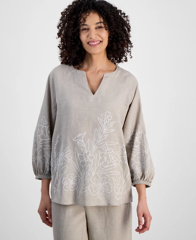 Charter Club Women's 100% Linen Floral-Embroidered 3/4-Sleeve Top, Macy's Exclusive