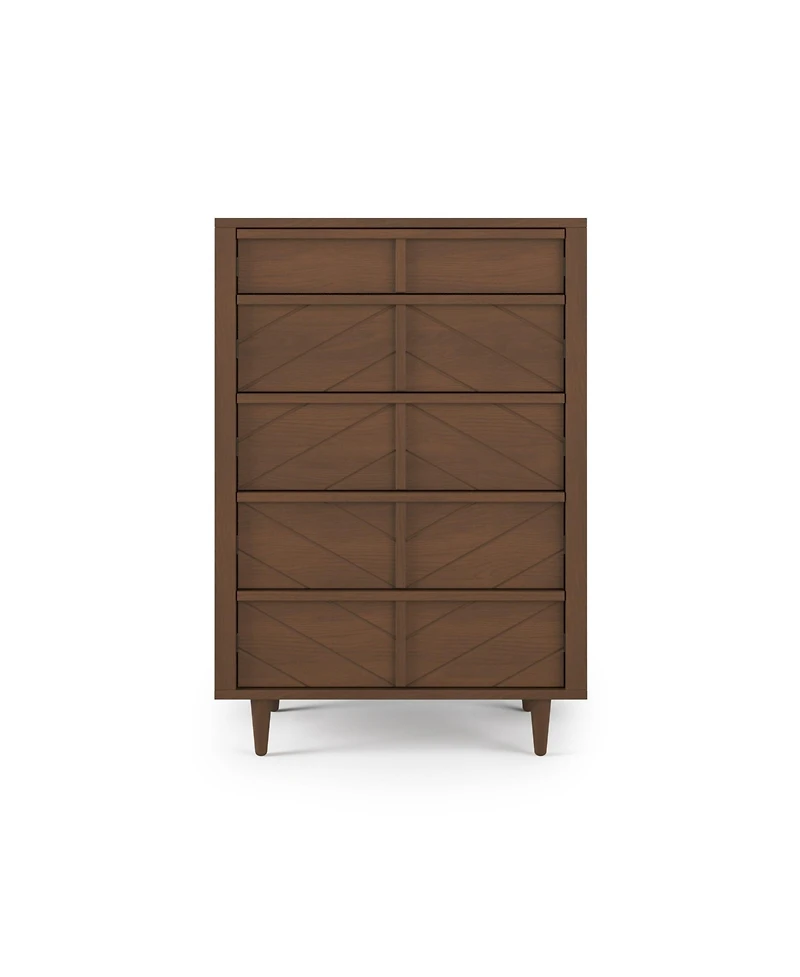 Child Craft Surrey Hill Furniture Collection: Add an upscale flair to your baby s nursery with the Surrey Hill 5 Drawer Dresser. This contemporary nursery dresser features angled cuts on the drawer fronts, creating an elegant diamond pattern. The turned legs and long wooden drawer handles add to the modern simplicity. 2 sophisticated finishes highlight the dresser s unique features. Pair with coordinating pieces from the Child Craft Surrey Hill nursery furniture collection to complete your child s bedroom. Assembled dimensions: 33”L x 18” W x 48”H. Top Drawer dimensions: 27.24" L x 13.35" D x 3.79" H. Bottom four drawers: 27.24" L x 13.35" D x 7.92" H.