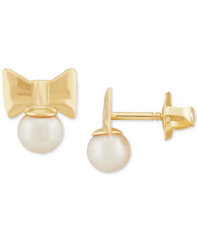 Children's Cultured Freshwater Pearl (3-3/4mm) Bow Stud Earrings in 14k Gold