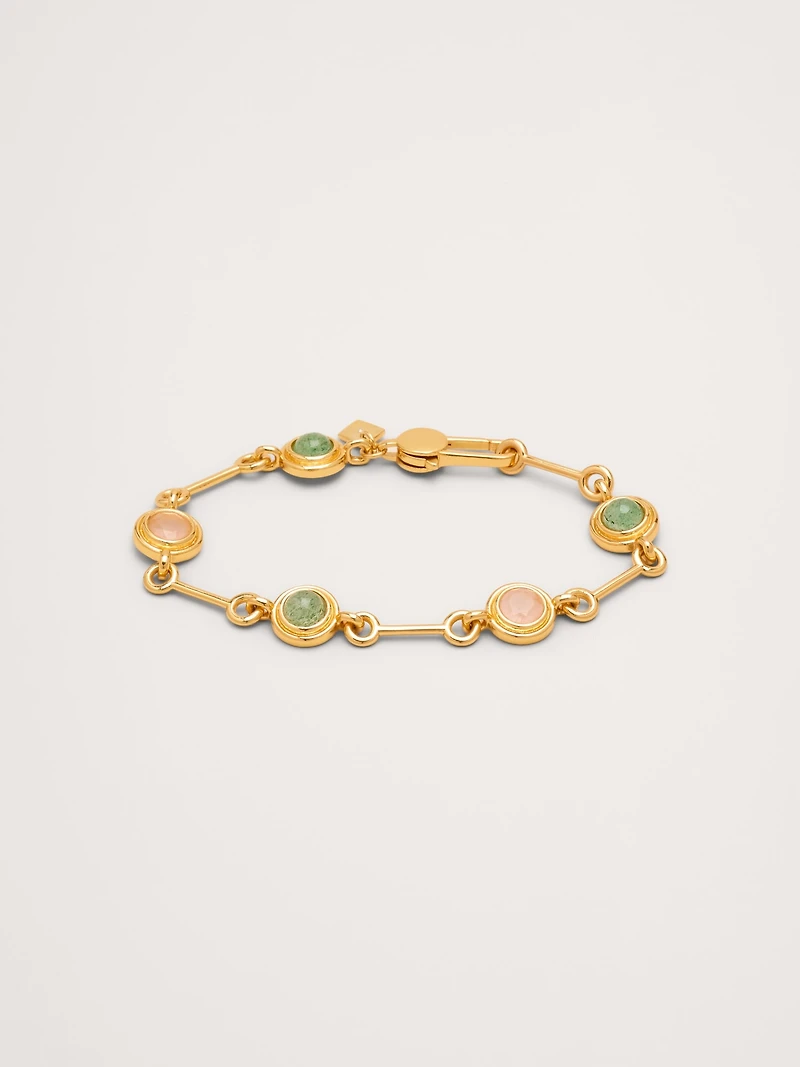 A variety of long and short bar links intersect with shining gemstone accents, in your choice of 14k-gold or 999-silver plated brass. 14k-gold or 999-silver plated brass. Lobster clasp. Rose quartz and green quartz stones. Length: 7. 5"