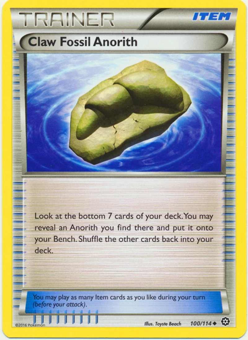 Set: Steam Siege Card Number: 100/114 Rarity: Uncommon Illustrator: Toyste Beach Card Type: Trainer - Item Name: Claw Fossil Anorith Finish: Regular Card Text: Look at the bottom 7 cards of your deck. You may reveal an Anorith you find there and put it onto your Bench. Shuffle the other cards back into your deck. Manufacturer: The Pokemon Company