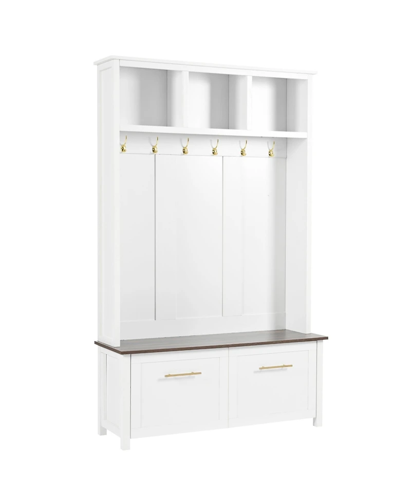Organize your entryway in style with this versatile 4-in-1 hall tree. It combines a storage bench, a spacious shelf, and six elegant golden hooks into a single, space-saving unit. This practical yet chic piece keeps coats, bags, and essentials neatly at hand.